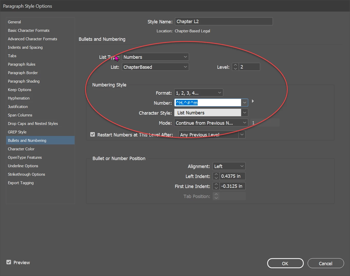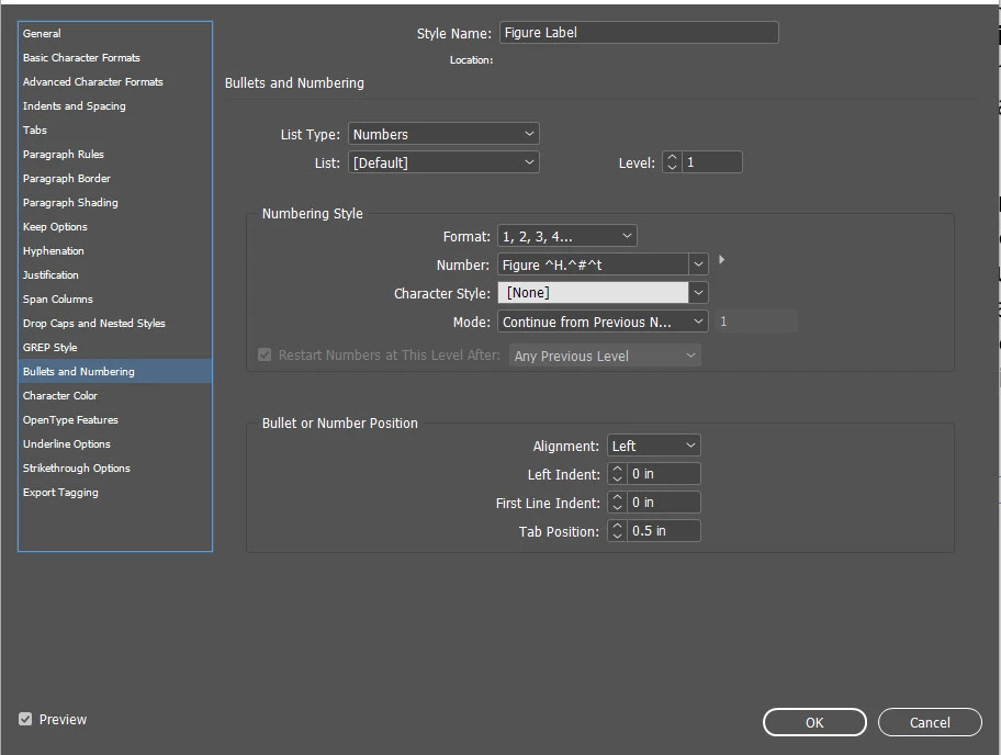 Below is a screen shot of my List Number settings. Can someone help me figure out what went wrong? I tried closing the document and opening it up again, but that didnt help.