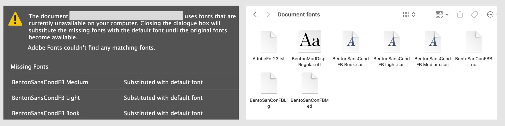 Basically I opened a .indd file with a package with all fonts link inside on my Mac (right image). But Indesign still shows that the fonts are missing (left image). I first called Apple for helps, but they said it is not Mac's problem. Therefore, I am wondering if Adobe's problem or something else.
