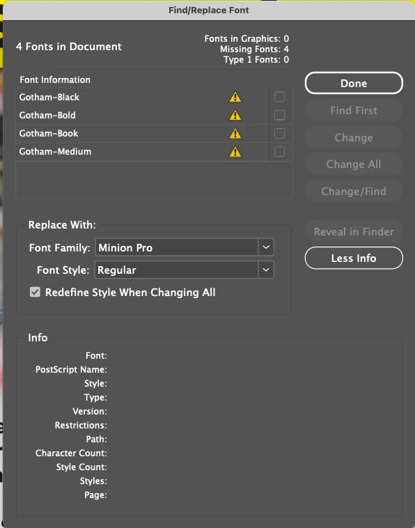 I've already set my Basic Paragragh style from Minion Pro to my preferred font (by selecting my preferred font — with no document open — in the Character window and by modifying my Basic Paragraph style in the Paragraph Style window). This works great for opening new documents. My problem is this: How can I change the default replacement font when I accessthe Find/Replace Font option in InDesign? It always comes up as Minion Pro. I'm using InDesign 20.4.1 on a Mac running OS 15.5.