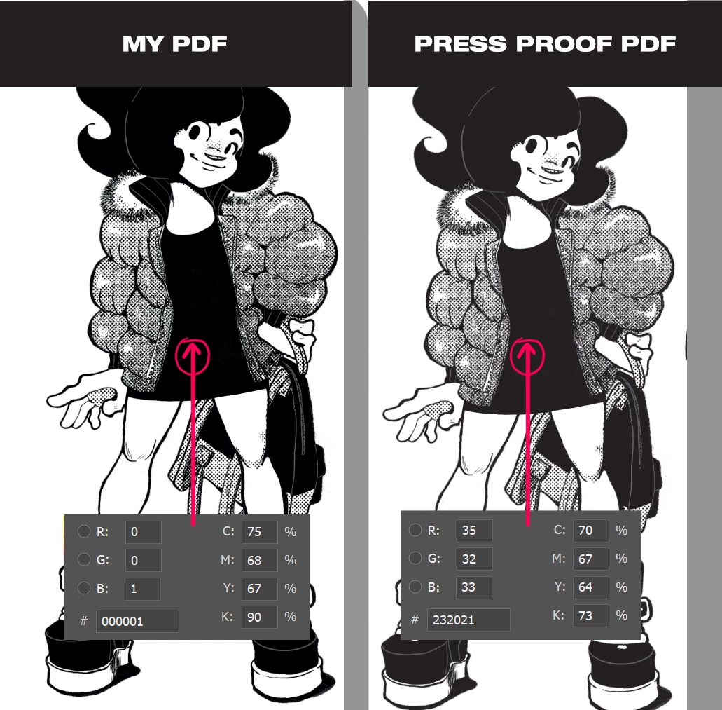 The blacks looked less deep, and my printer explain to me that was because the printer that he used didn't use CMJN black but only Black 100%.