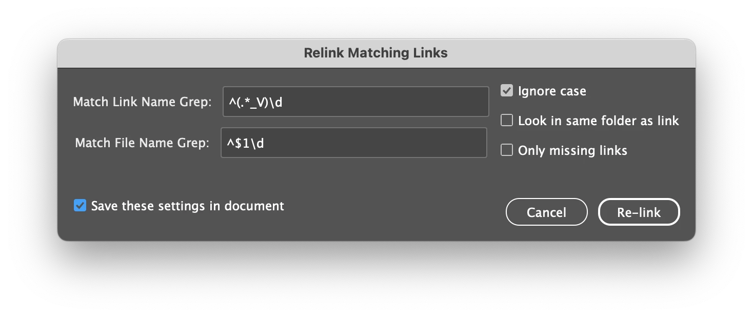 * @discussion https://community.adobe.com/t5/indesign-discussions/how-to-batch-relink-asset-to-same-file-name-but-with-different-version-number-different-ending/m-p/14358429