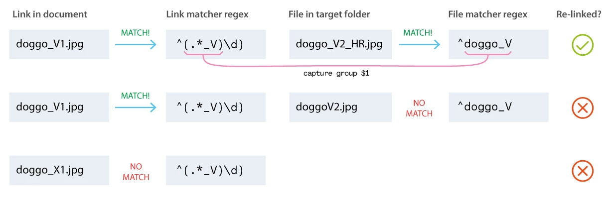 Edit 2024-01-18: added better result alert to show how many links were matched as well as how many links were re-linked. Also adjusted example configuration because some of lukes files use a lowercase _v.