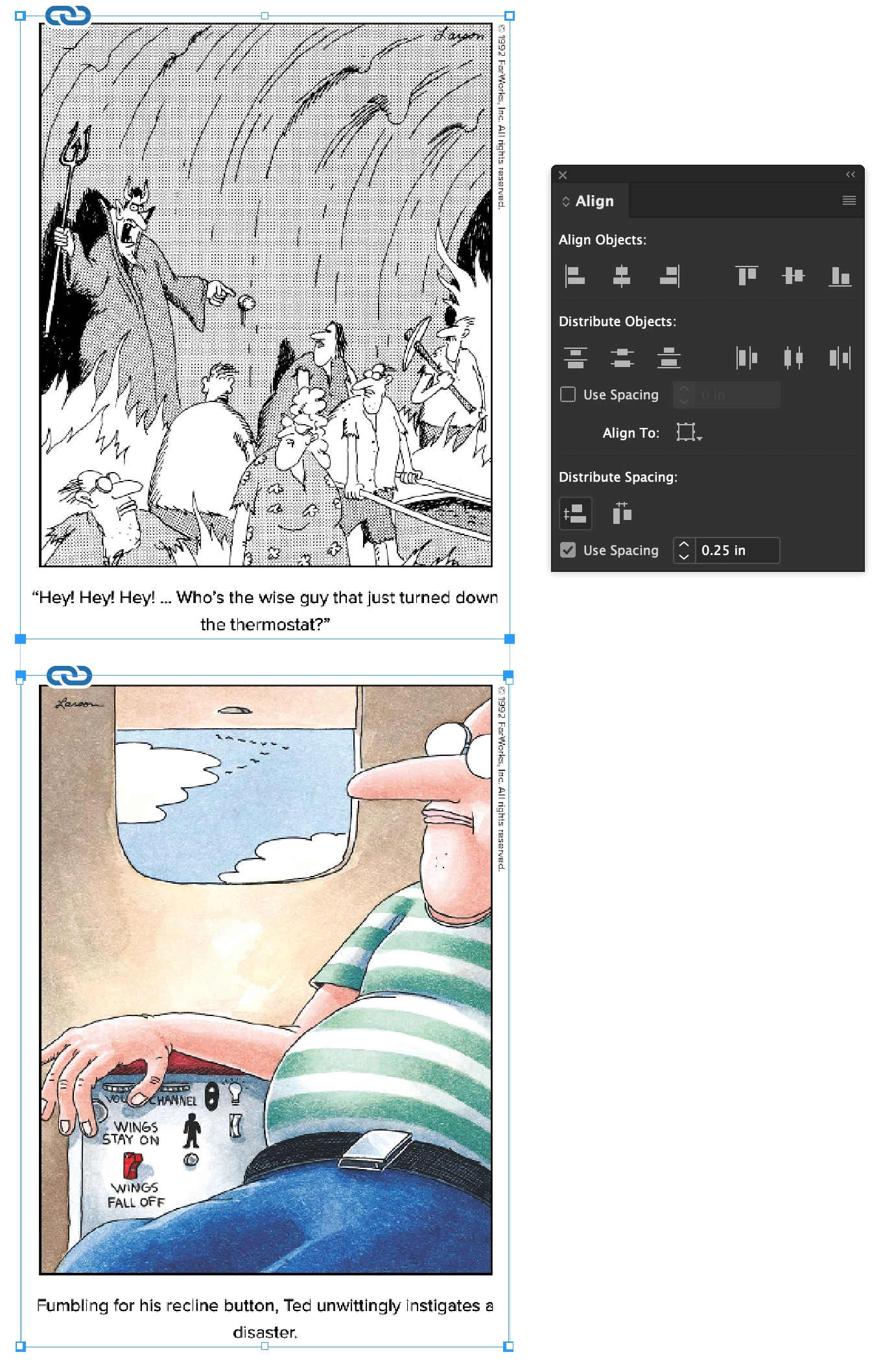 This may sound simple but for the life of me I cannot get these two images to center evenly and vertically on the page. I want them sitting in the center of the margin with .25" of space between them. thats it, thats all I want, but the top image still aligns to the top. I've been at this for a long time and feel really foolish so can anyone help me with this?