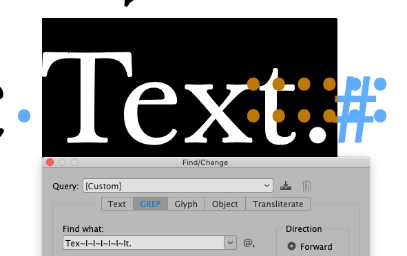 So there are six occurrences of "~l" between the "x" and the "t" here. The problem is if I search for "~l" (without quotes), InDesign tells me "Cannot find match" although they are right there.