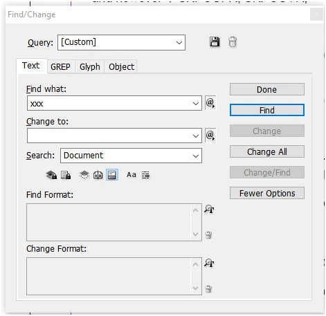 What info needs to be entered in the Find/Change fields/boxes to do this? Or if it's easy to do, please enter the info needed and upload a screenshot of the Find/Change box as a reference to use.