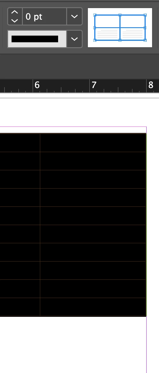 Select all the cells in the table from the upper left corner, then, with all of the stroke indicators showing blue, change the line weight to 0.