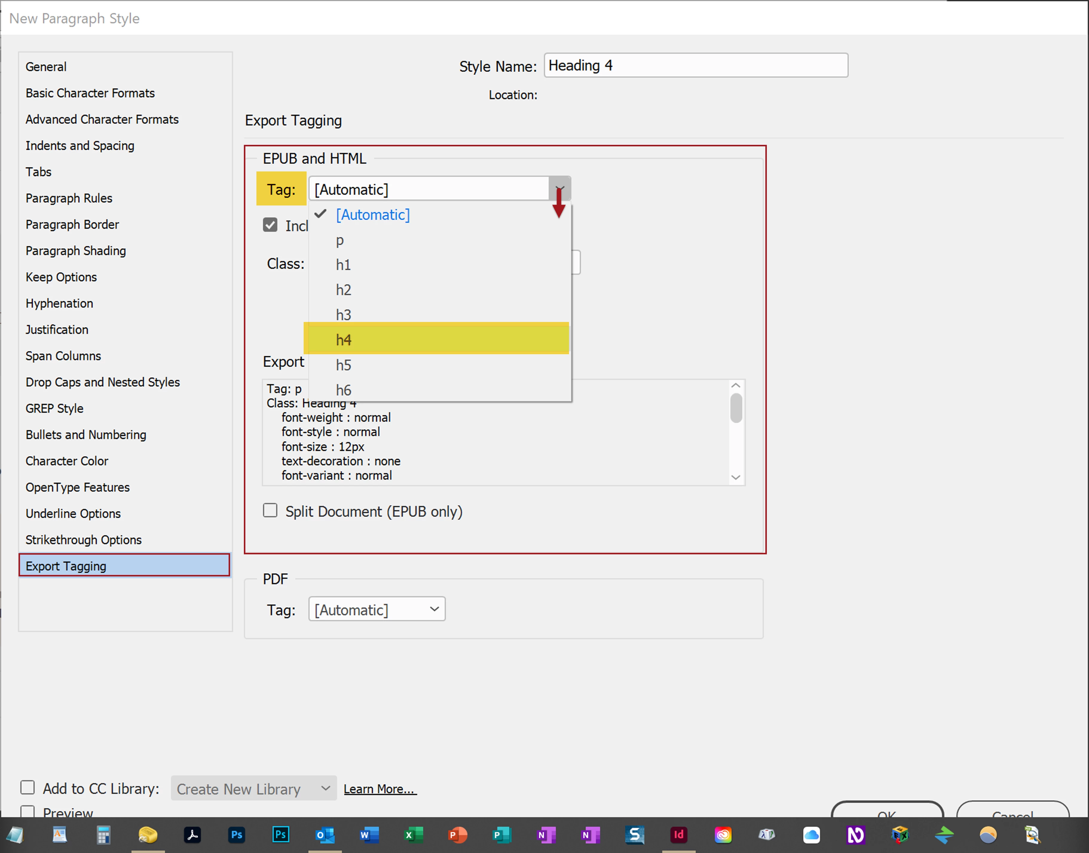 I have a very simple document structure. I have InDesign paragraph styles called h1, h2, h3, h4. When they are exported to ePub, InDesign make all elements as P elements: