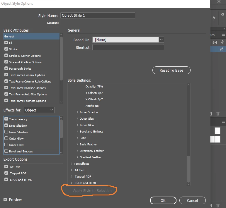 I am trying to create an object style (a drop shadow) to a image in a frame so that when I click on the object style it changes all of the drop shadows at once instead of having to do them individually. I am using windows 11 and it's just that I can't seem to get the "apply style to selection" box being greyed out, sorry if this doesn't make sense, see screenshot.