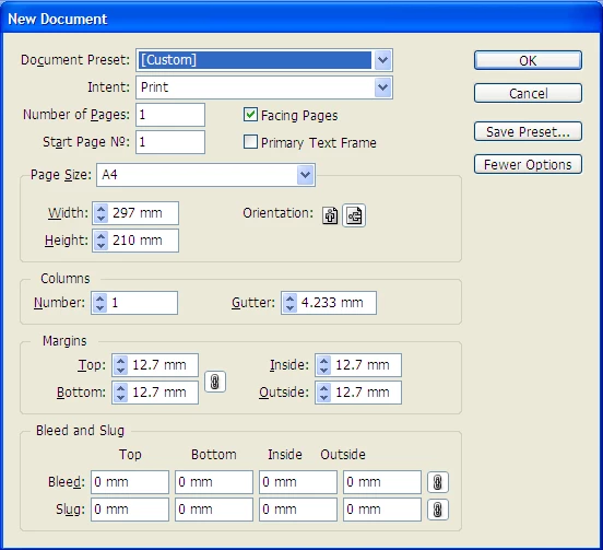 The document size is 286x210 and the bleed is 3mm on all four sides. Turn off facing pages.