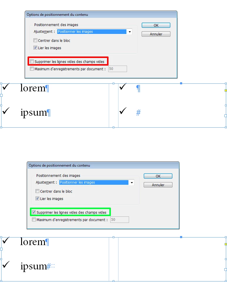Before a few of the entries I want to show a checkmark (in text or as a vector object), but only when this entry is present (column is filled) in the datamerge file.