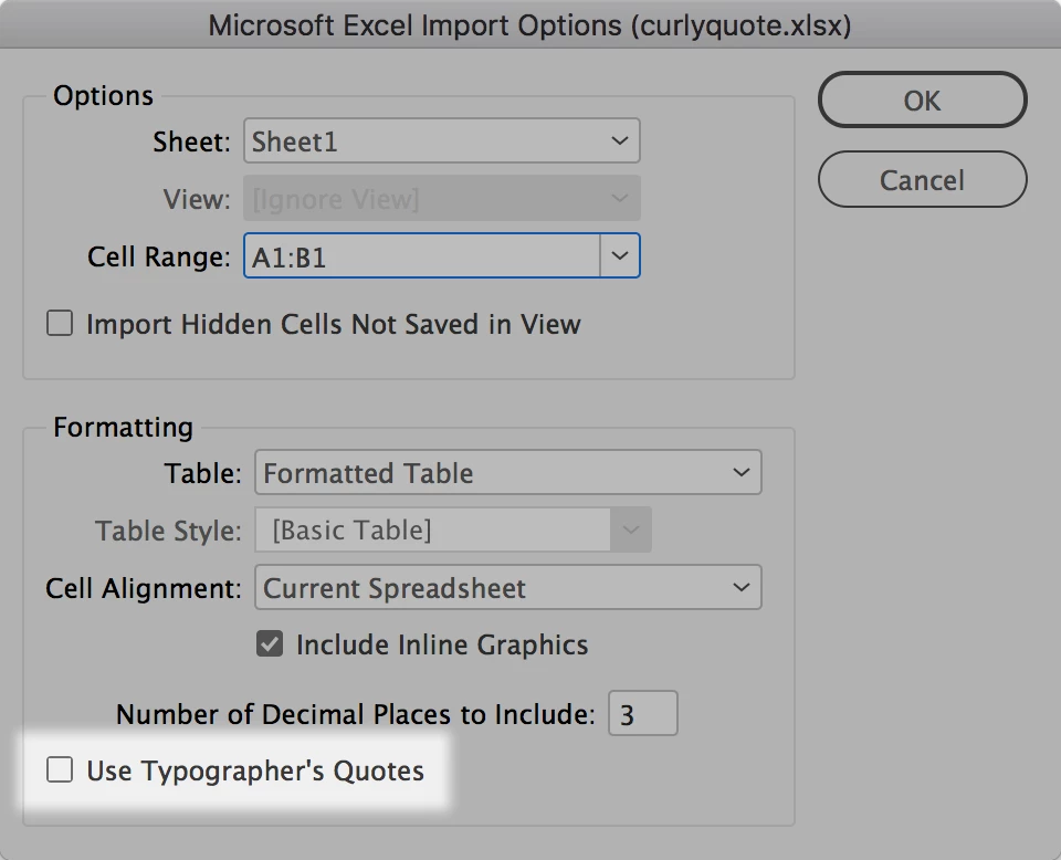 I am building a product catalog for my employer. I am using linked Excel spread sheets to create tables showing fitment, tubing inch sizes and related part numbers. I find that some of the sheets show the straight quotes and some show the correct curly quotes (double primes).