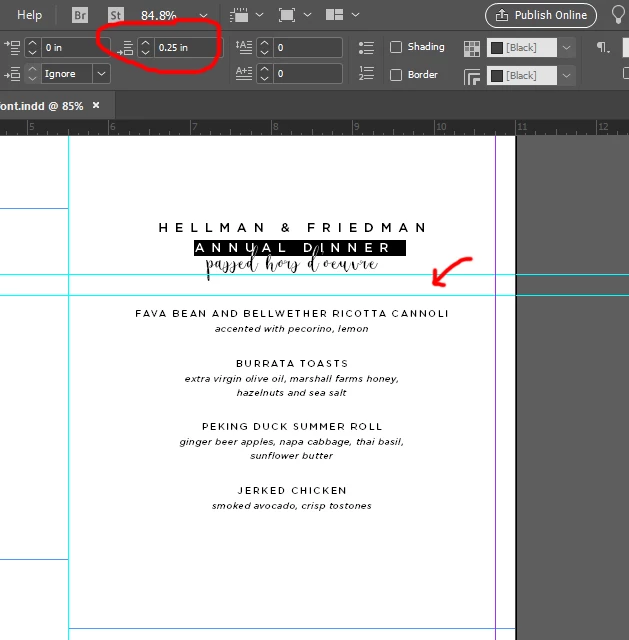 In the first image I'm about to apply Space Below. You'll see in the second image I increase Space Below with "Annual Dinner" still highlighted, but it does not move the script font line "passed hors d'ouevre" down, and instead increases the space below passed hors d'ouevre. And ideas?