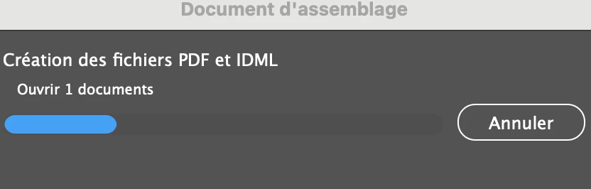 J'ai fait un assemblage indesign, mais je suis bloqué sur cette page de dialogue depuis 1h et je ne peux pas annuler, ni forcer l'arrêt de l'application. Avez vous une solution ?