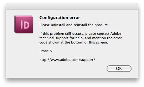 I've installed CS5 Premium. When I try to start InDesign CS5, I get this error: "Configuration error. Please uninstall and reinstall the product. If this problem still occurs, please contact Adobe technical support for help, and mention the error code shown at the bottom of the screen. Error: 5. http://www.adobe.com/support/". It looks like this: