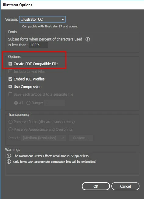 • In Illustrator save the logo with the 'PDF compatible file' ticked