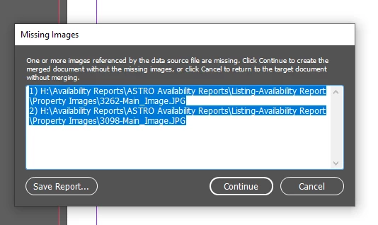 I am doing a data merge to InDesign and most of my pictures show up fine. Some however are not being transferred like the rest. I'm not sure what the problem is. I've double checked and tripple checked the filepath, photo location and everything. When I go to complete my data merge I get this error. You can see in the image below that that it's pulling the pics before and after just fine.