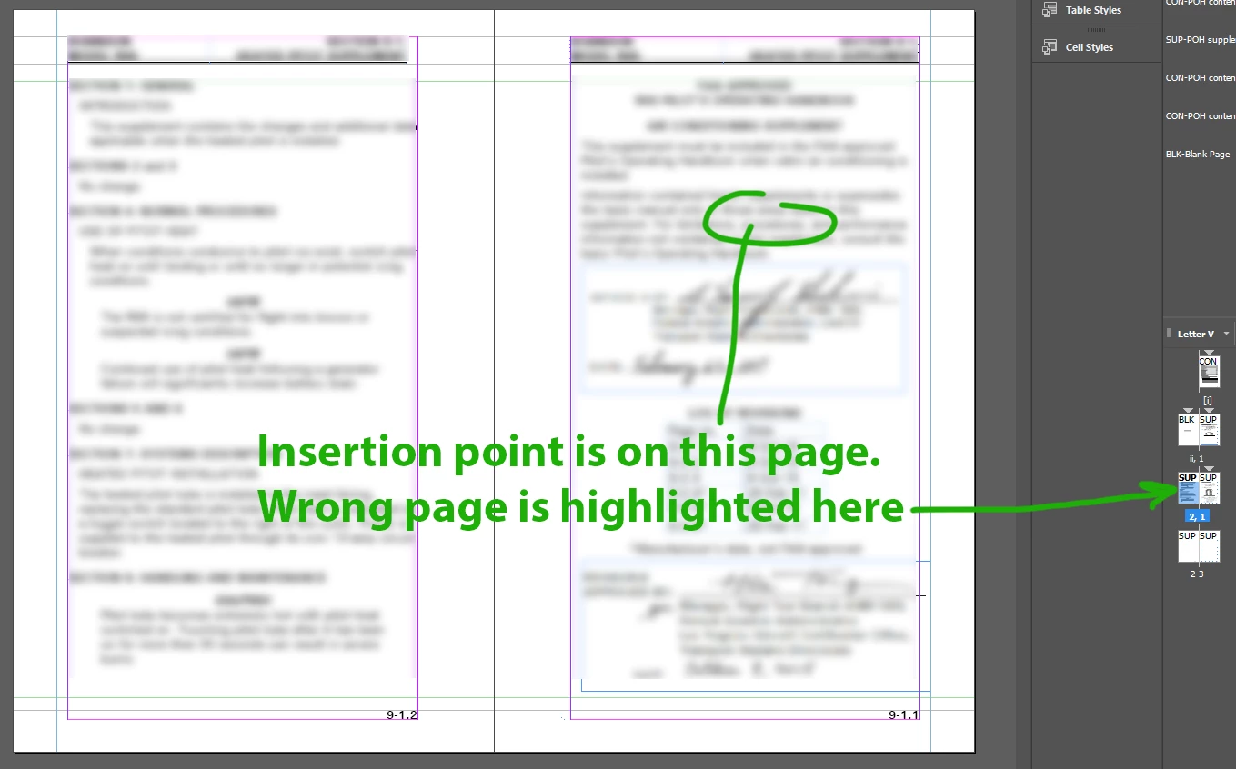 With the insertion point sitting in text, I expect any changes made to the section or chapter options to affect the section in which I'm working; not in some arbitrarily (and automatically) highlighted thumbnail in a disconnected pane.