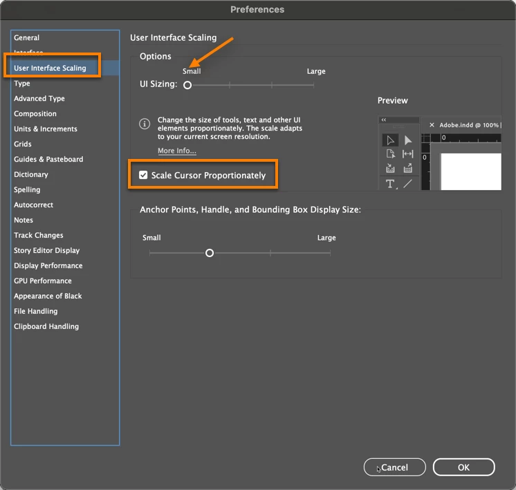You can reduce the UI scaling in InDesign, which you said you tried, but did you enable Scale Cursor Proportionately? You might try it on and off (restart after each change).