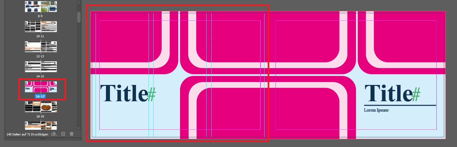 Das sind jeweils 2 Titelseiten einmal für die linke und einmal für die rechte Seite die in ganzen Dokument mehrmals vorkommen. Allerdings kommen diese Seiten nicht zusammen sondern nur einzeln vor. Der Gedanke hier war, dass ich egal ob die Titelseite links oder rechts ausfällt, für beide Varianten bereits die entsprechende Musterseite habe. Zusätzlich sollte diese Musterseite bei hinzufügen von weiteren Seiten sich entsprechend automatisch anpassen ohne dass ich diese nochmal neu zuweisen muss. Doch gibt es folgendes Problem: