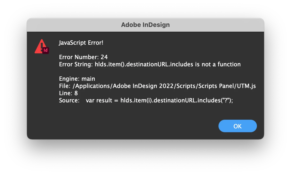 When I run this in InDesign I get an error I have shown attached as a screenshot.
