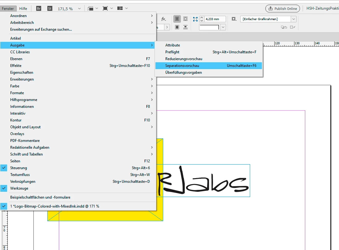 Kontrolle über die Separationsvorschau, ob die Sonderfarbe "Lack" angewendet ist und überdruckt: