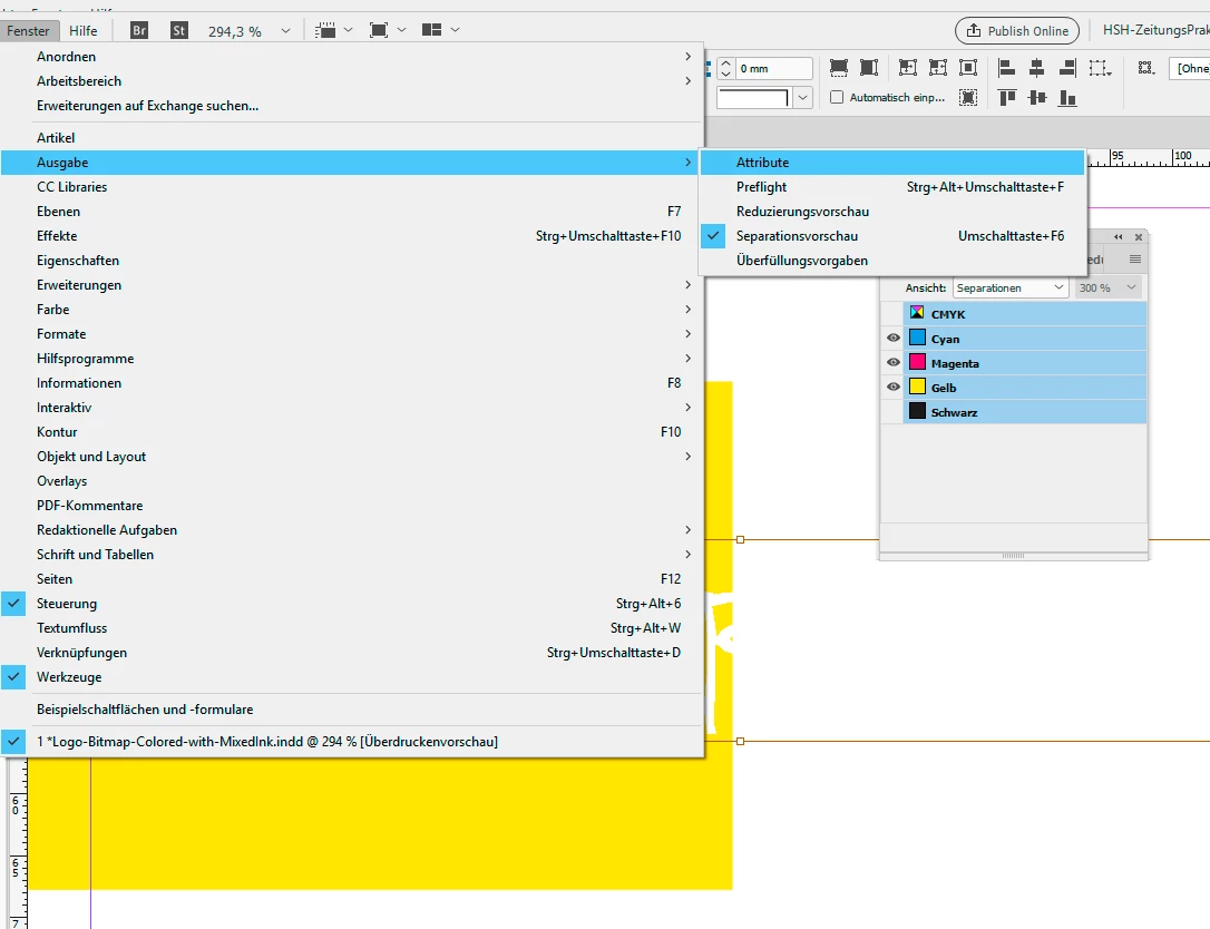 Ich möchte das korrigieren, um zu vermeiden, dass nach dem Druck möglicherweise kleine weiße Ränder um das Logo herum stehenbleiben, da keine Druckerei der Welt alle Druckfarben registergenau drucken kann. Dazu setze ich die Füllung des Logos innerhalb seines Grafikrahmens auf "Überdrucken".