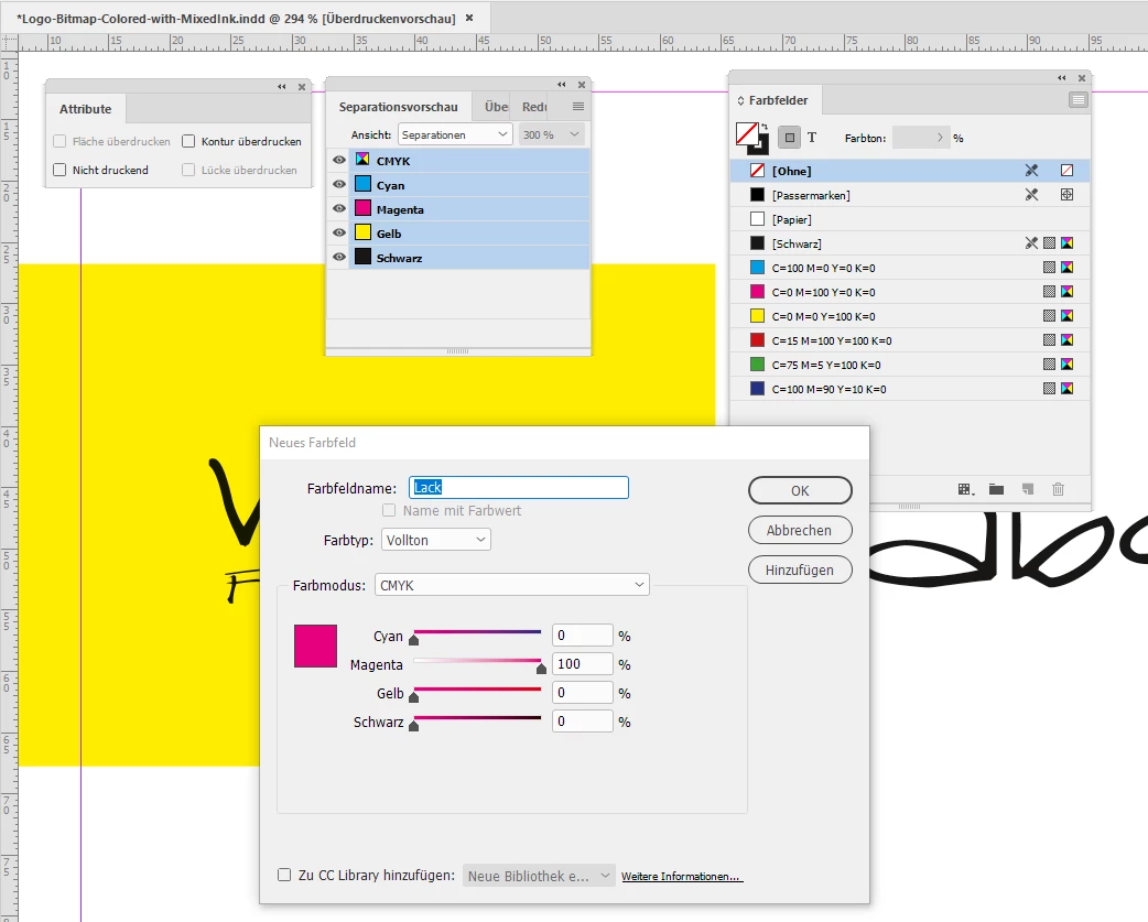 Der nächste Schritt ist das Erstellen der Sonderfarbe "Lack", die zusätzlich zu Cyan, Magenta, Gelb und Schwarz gedruckt werden soll.