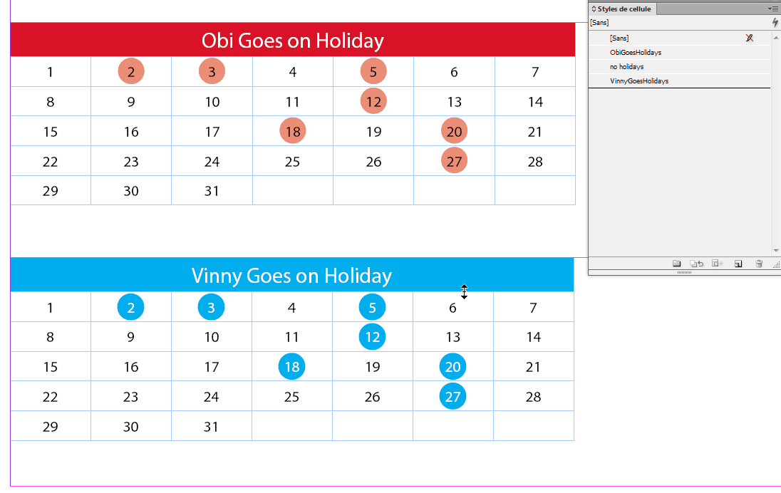 I am creating a calendar in InDesign and want to style the holidays with a filled circle behind the date. How can i Do that through cell styles? One possibility would be to make the cell border corners round (if the round corners are big enough, they make a full circle. But this round corner option only works for the whole table, not cells (as far as I know). Any other ideas?