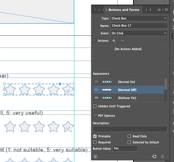 I am trying to create a survey as an interactive pdf in InDesign. I have set this up using the Button tool in InDesign, and using the Checkbox option. This automatically adds a checkmark on the active position, but I have deleted this and edited the active state instead to change the color of the object.