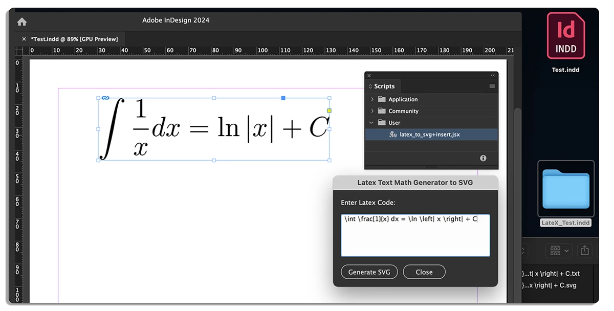 For those who looking for, script to insert Latex Math into InDesign as SVG