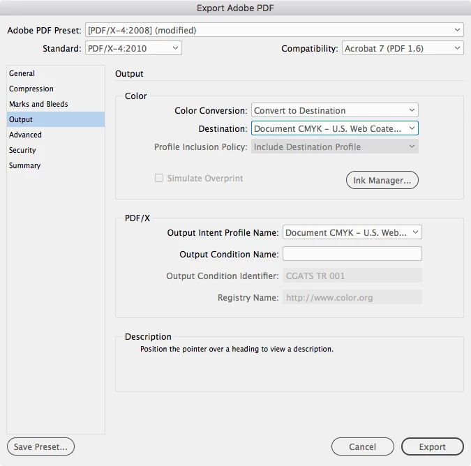 By default PDF/X-4 exports with No Color Conversion, but you can get the same conversion to CMYK the default PDF/X-1a provides by converting to Document CMYK in the Output tab. The output values of a document exported to X-4 or X-1a with the Destination set to Document CMYK would be identical.