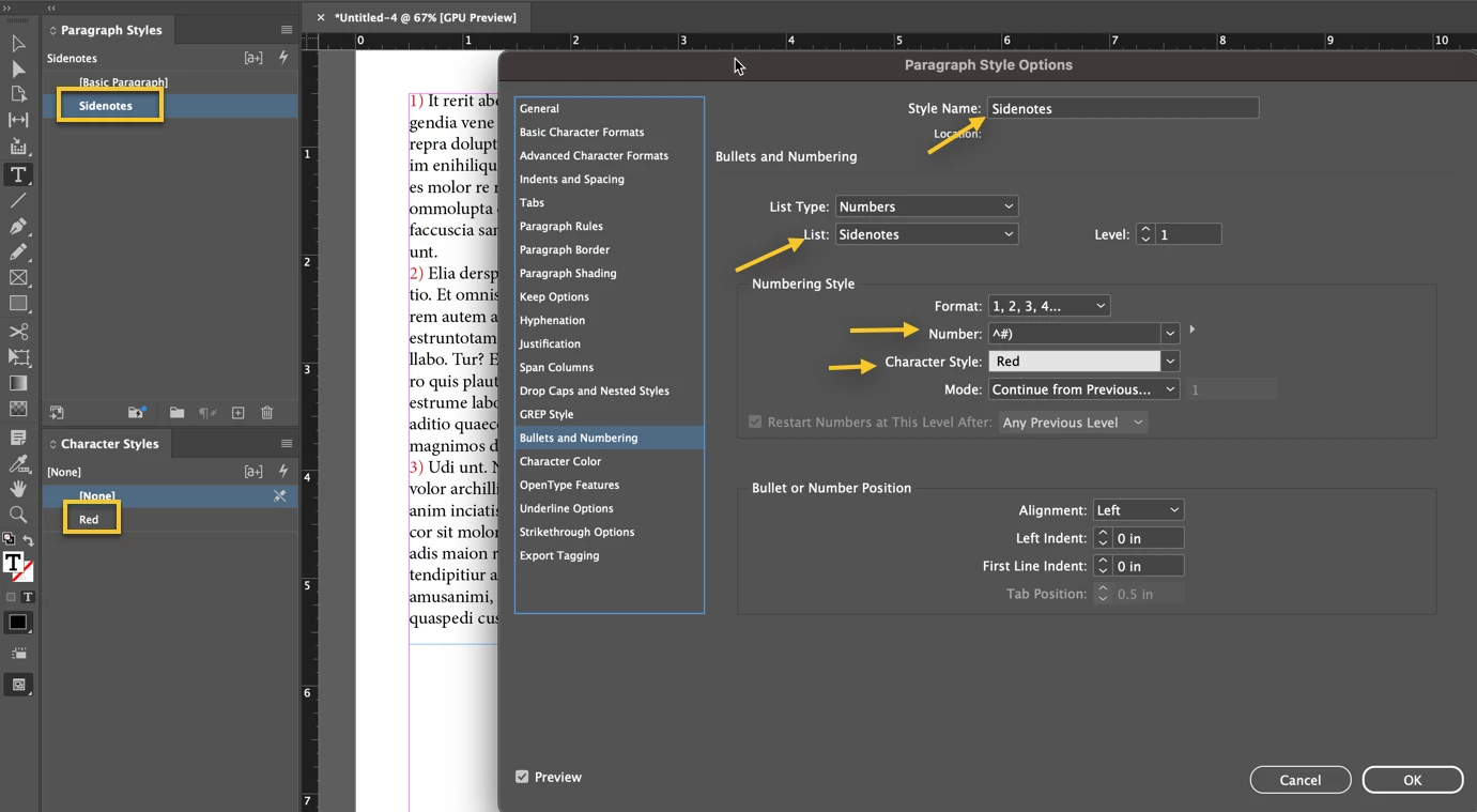 I looked at your file and it is indeed complex. As a heads up, you will be able to number the sidenotes with autonumbers too, including the red color and the close parentheses. To make sure you don't lose your mind, please read up on styles: paragraph and character styles. You will need both. InDesign can handle multiple numbered lists (I know of three you need so far) as long as you name each list.