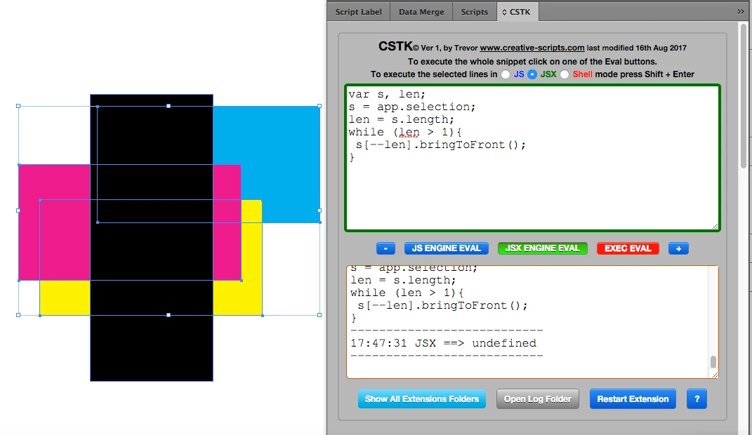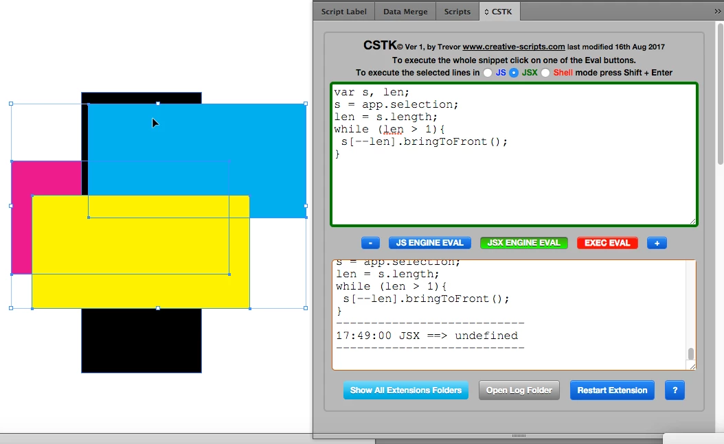 Trying to build script (JAVA) that when several objects are selected (i.e. three rectangles), exclude the first selected object and then bring others to front. Trying to use bringToFront() method but stuck. Not working. Please help ![]()