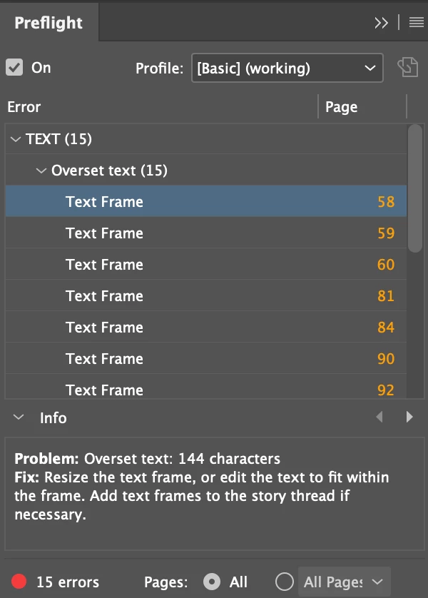 Question: Why does iD Preflight panel throw an Overset text error on these threaded frames? If I connect Frame1 to Frame2, wouldn't iD know that the container has been extended? I've tried tweaking the frame sizes, in all threaded frames, but this does nothing.