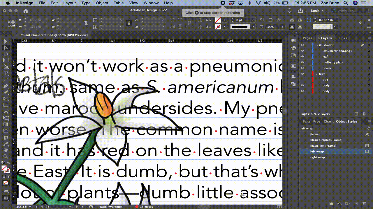 I am trying to make a path to use for custom text wrapping. The "select subject" intelligent wrapping isn't working very well and I just want to make my own path instead of editing the one it generates. I'm uploading a short video of what is happening. It goes like this: