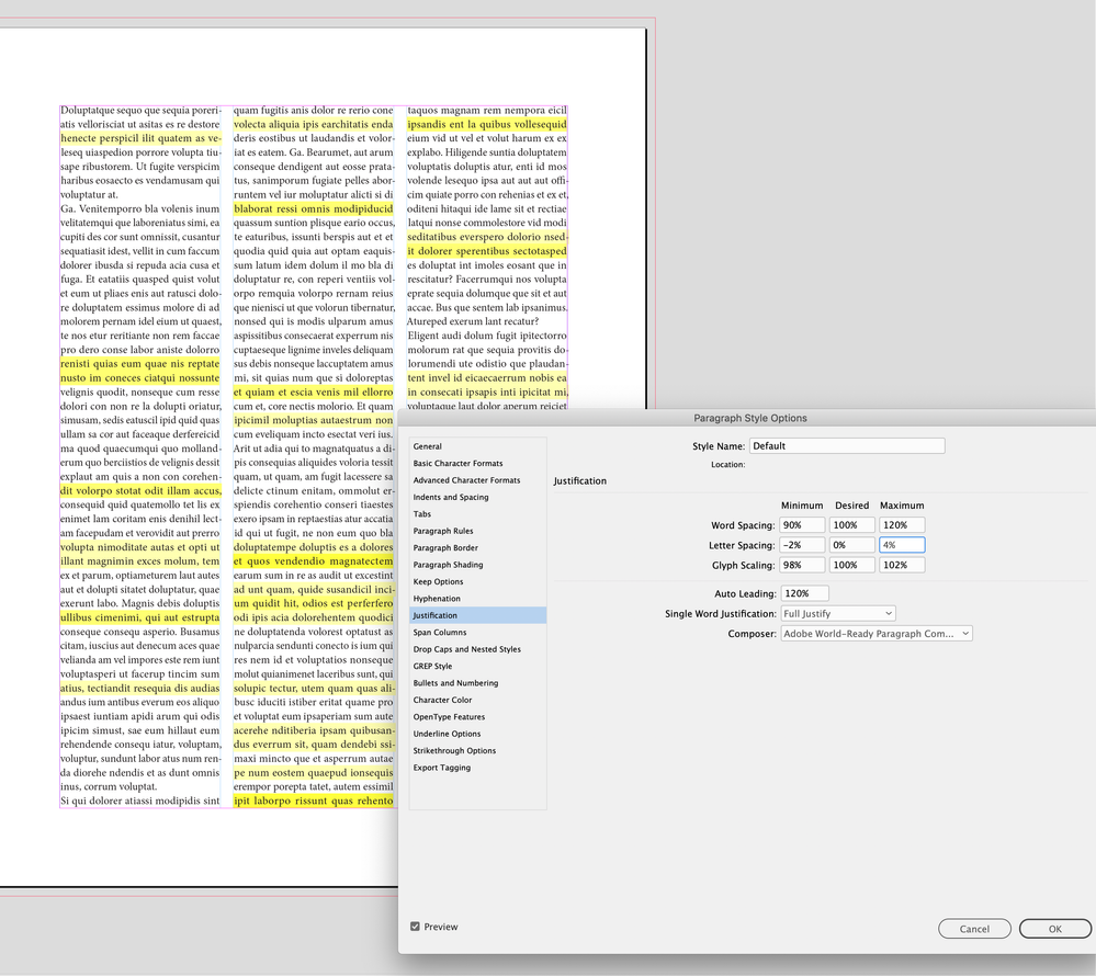 The InDesign default loosens up the rules for Word Spacing and allows word spacing to flex between the 80% and 133% , with the ideal being 100%. However, there will still be violations because there is no flexibility allowed with letter spacing and glyph scaling