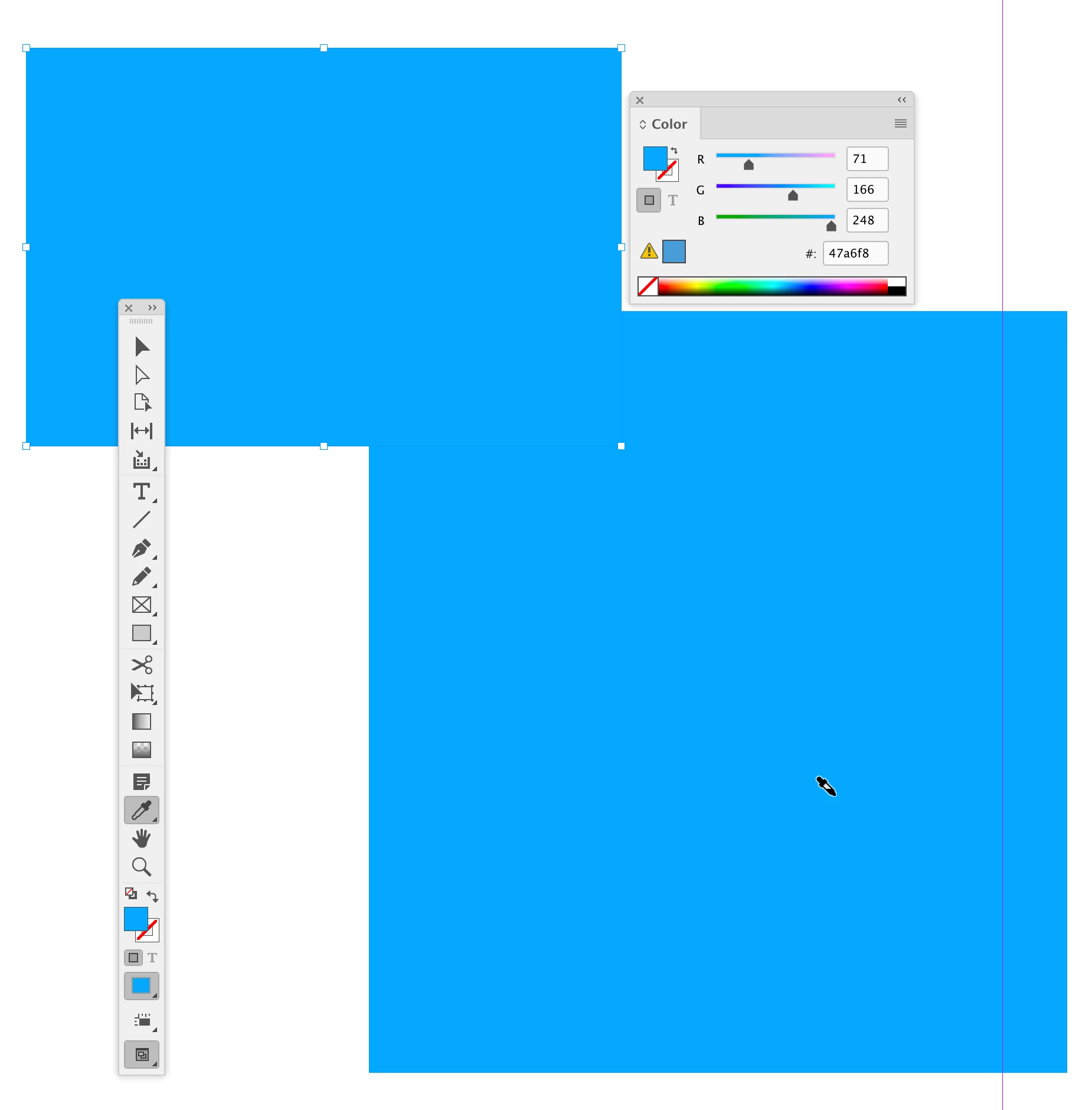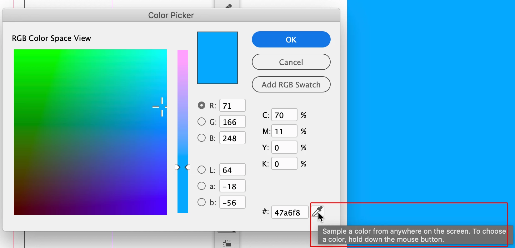 I’m looking to use the blue from the right-hand side (this is an image) to fill the vector rectangle on the left. I’ve used the colour picker and selected the colour 71,166,248 from the image as you can see. However, when viewing both overlapped the colours are different, I can also see from reopening the colour picker that although the colour is set to 71,166,248, it is shown as 95,166,241.