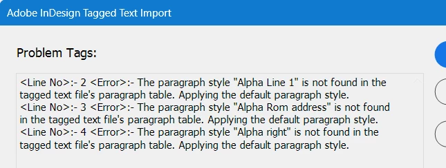 <pstyle:Alpha right><cstyle:No break>エルリック<cstyle:>Then it no longer complains about the styles, but it creates new paragraph styles with none of the formatting I want. I don't want to create new styles - everything is already nicely defined and organized in the document I'm importing into.