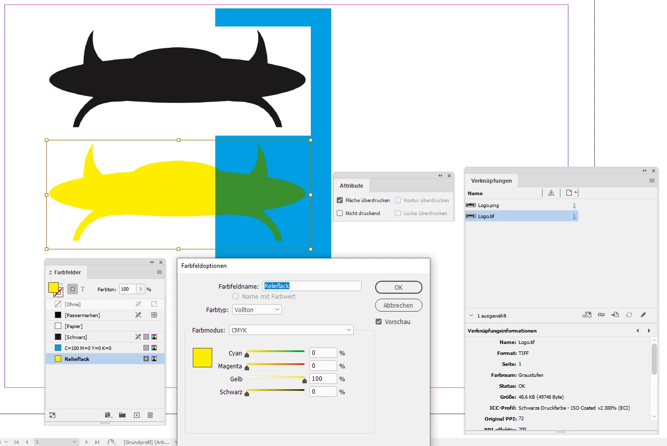Ich soll eine Druckdatei mit einer Volltonfarbe für den Druck mit Relieflack anlegen. So weit so gut, allerdings bekomme ich es nicht hin, das Logo als PNG mit der Volltonfarbe zu füllen. Meine Idee war dann, das Logo im Illustrator umzufärben und auf der neuen Ebene einzufügen. Allerding kann ich jetzt das Häkchen nicht bei " Fläche überdrucken " setzen. Woran liegt das? Weil das PNG ein Bild ist und keine Fläche? Wie kann ich das Problem lösen?