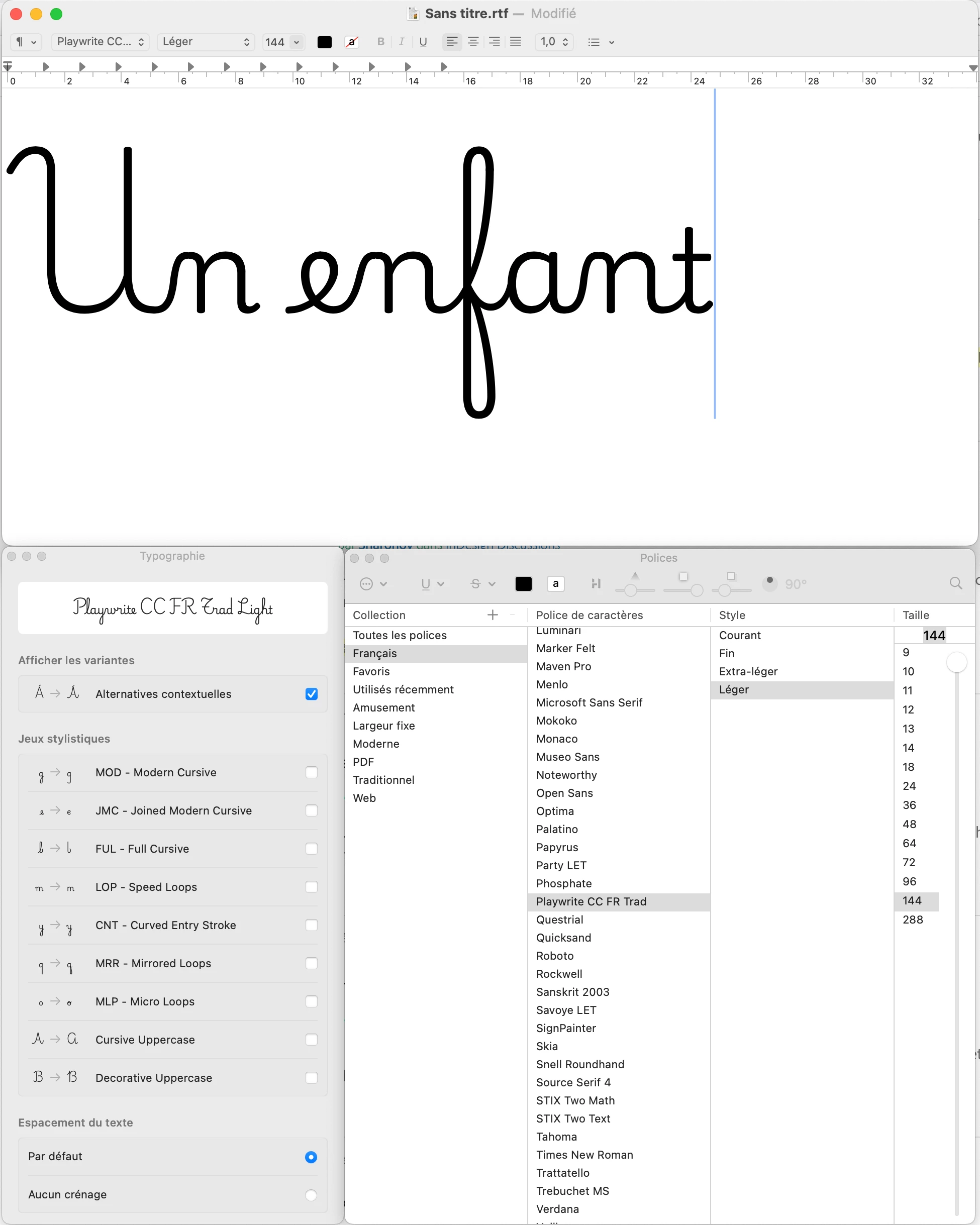 Dans TextEdit, l'affichage par défaut correspond au résultat attendu (lettre reliées, variantes contextuelles, etc.) :