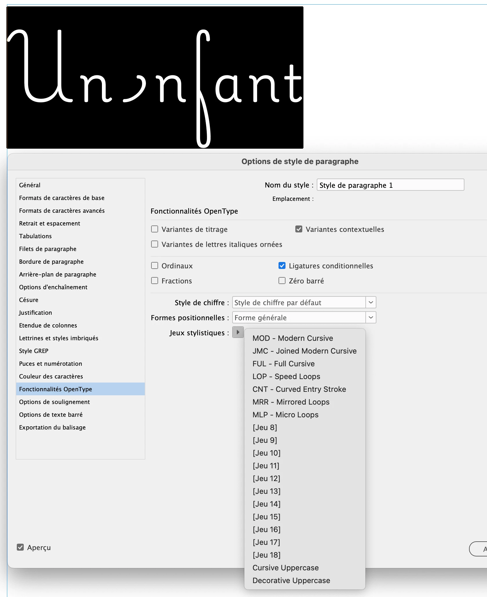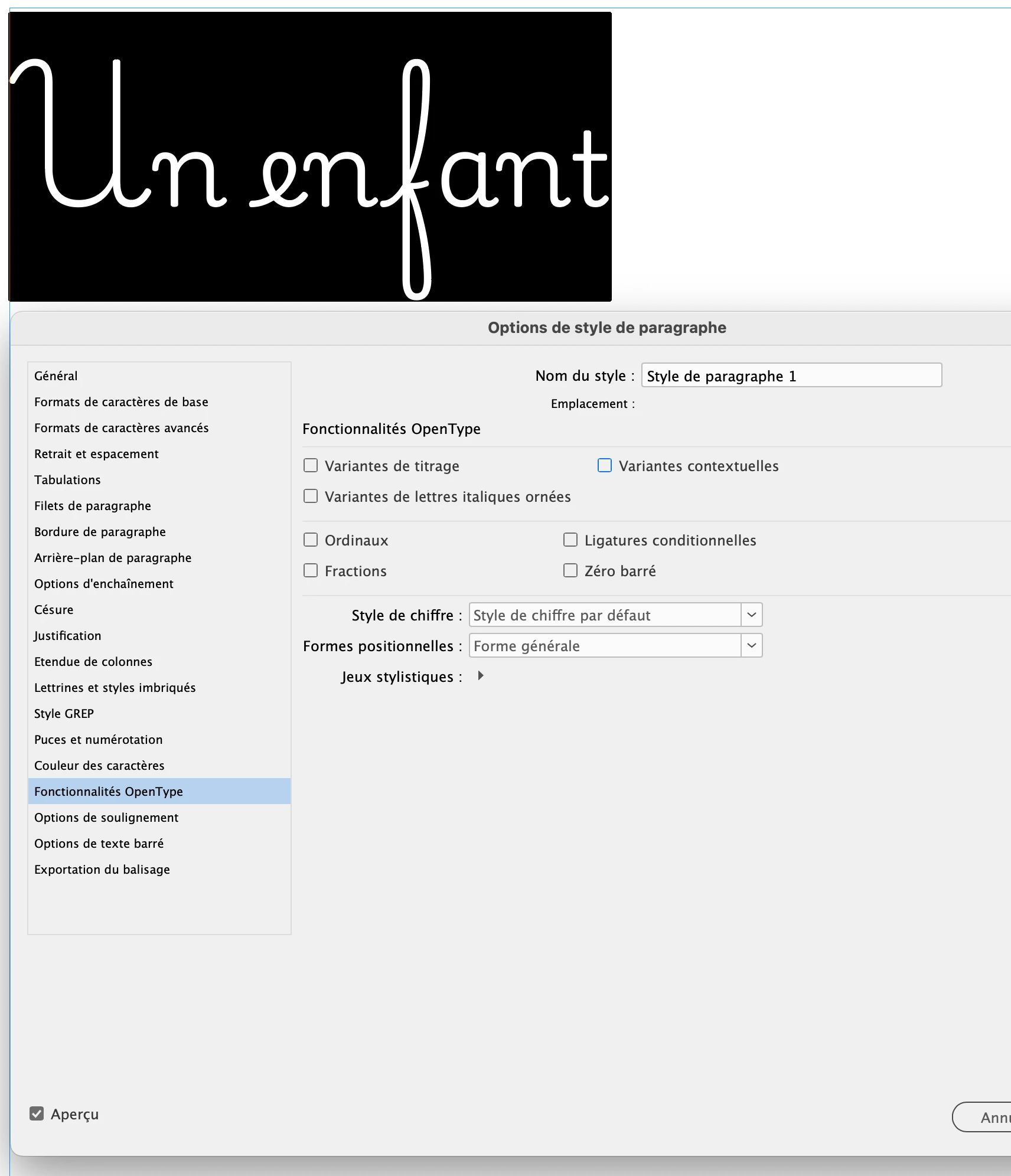 Police OpenType cursive : problème de ligatures et de variantes contextuelles dans InDesign