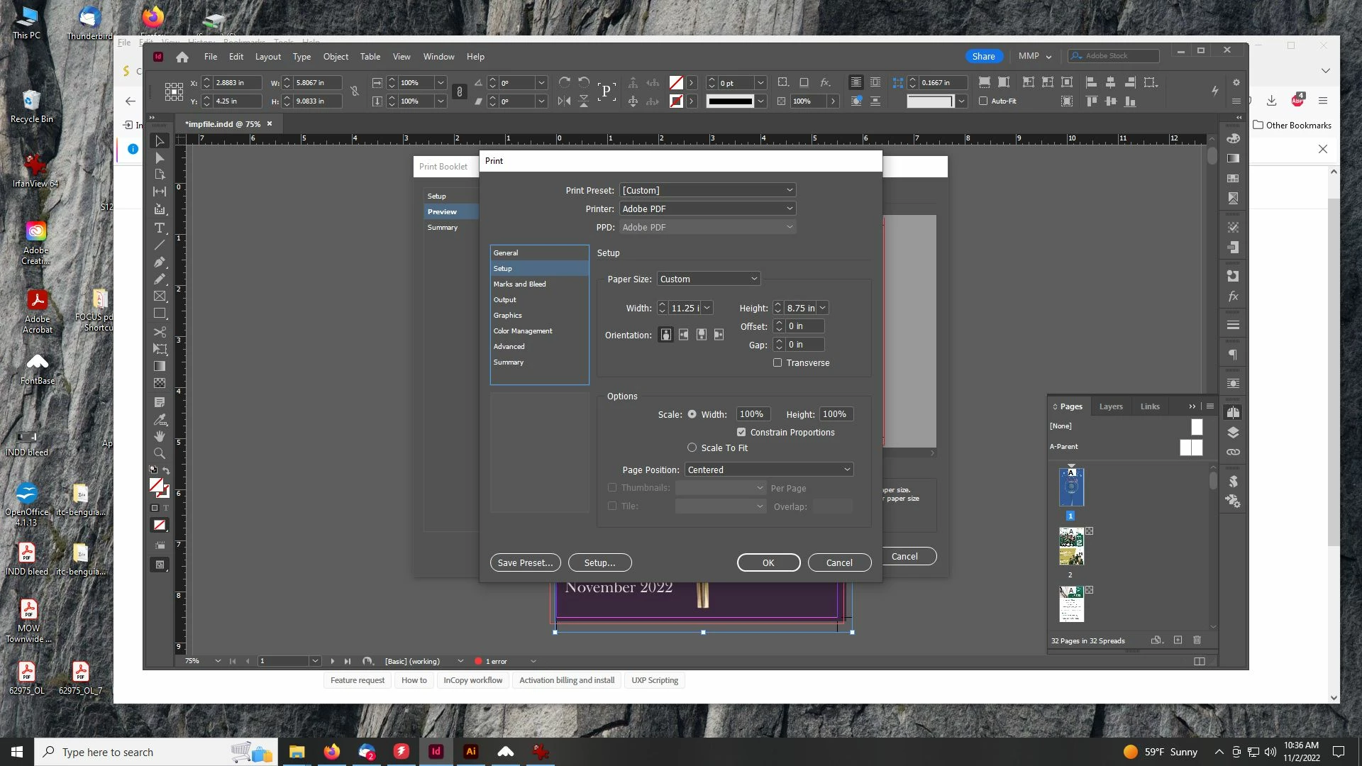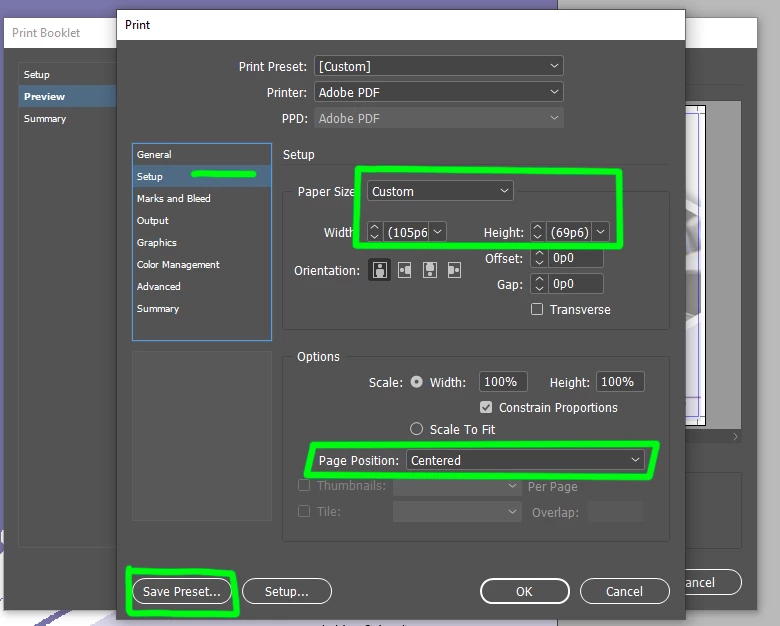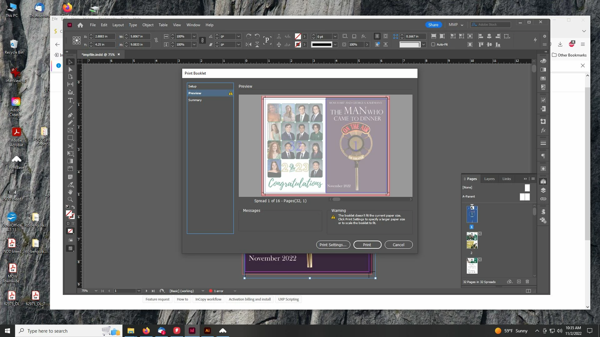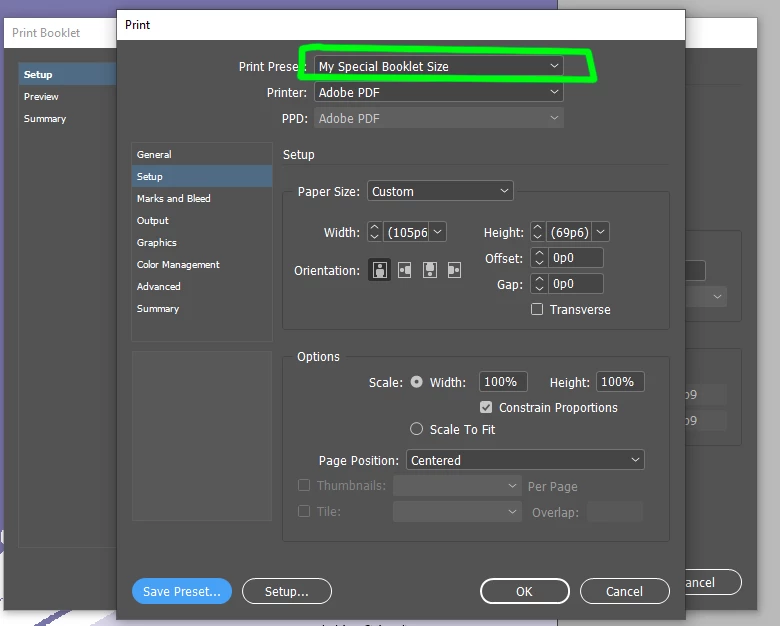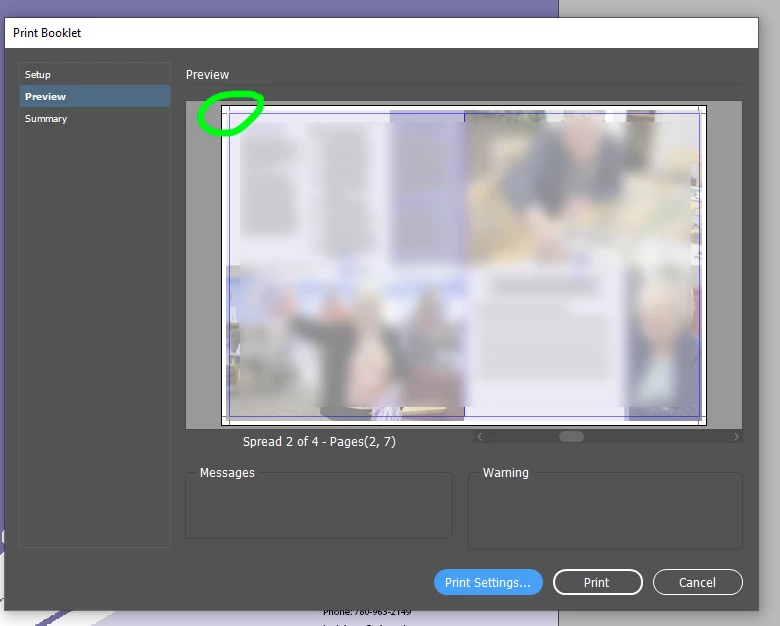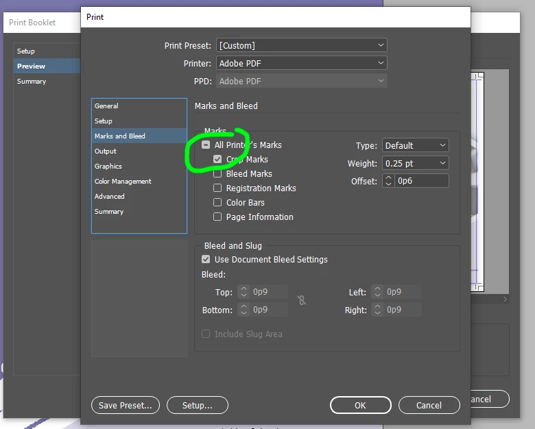 Attempting to create printer spreads using the print booklet feature, as I've done hundreds of times in the past using CS3. It's a digest size book when completed, 32 pages, with .125" bleed on the 5.5" x 8.5" page. I drop all of the single page PDF files in to my 32 page document, select print booklet, select my Adobe PDF printer, set the page size to letter, include crop marks, use document bleed settings (.125"), blah blah blah....literally all the same stuff I've done for years. Yet this program WILL.NOT.INCLUDE. crop marks and create the page size required for the marks to be included unless I manually set the page size to something larger than 8.75 x 11.25. I have never had to do this with CS3 - it would automatically set the page size needed whether you included no bleed, bleed, bleed with crop marks, or bleed with crop marks and bleed marks.