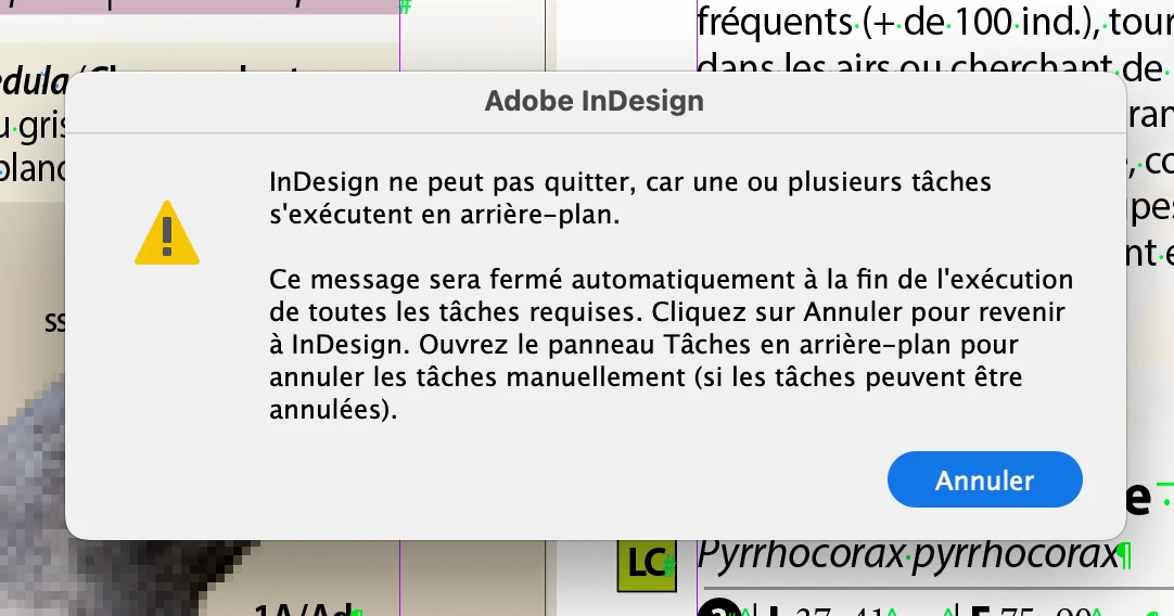 j'ai, depuis plusieurs mois, des problèmes d'exportation en PDF de mes fichiers avec InDesign : l'export se fait plus ou moins bien (le PDF est en général généré), mais la tâche en arrière plan ne s'arrête jamais ce qui conduit à un blocage d'InDesign qui ne peut se résoudre que par un forçage d'arrêt. J'ai cru un moment que le responsable était mon Imac, un peu ancien, mais je viens d'en changer il y a trois jours pour un tout neuf, nettement plus puissant, et je rencontre exactement le même problème. La taille du PDF semble ne pas être en cause (que je génère des PDF d'une page ou de plusieurs centaines ne change rien).