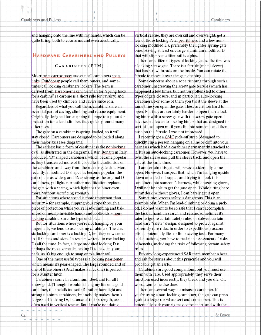 The first uses traditional positions: top and bottom, both towards away from the spine and towards the spine. This gives you four places to put headers, though one of them you should use for a page number. I think most would agree that the top away from the spine is the most prominent place, the bottom away from the spine the next most important place, and then towards the spine on the top and then towards the spine on the bottom. So, you can place your headers and page number based on position, and this provides some sort of hierarchy.