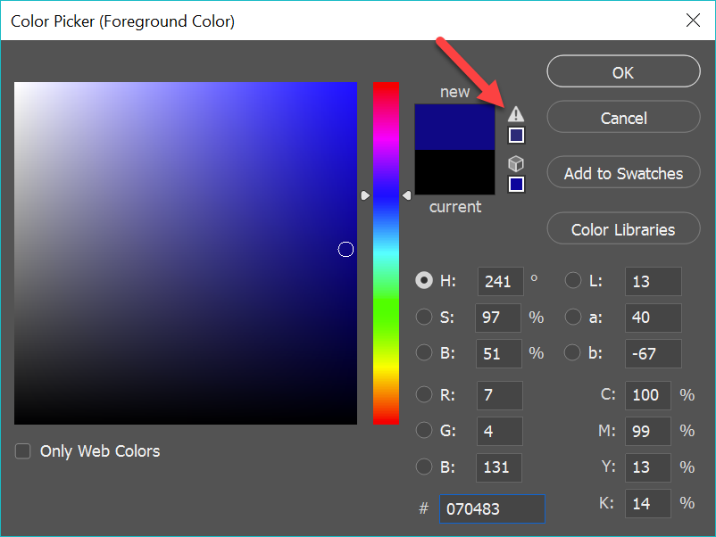 If you click on the icon, your color will shift into a CMYK-capable color.