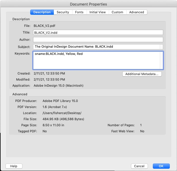 I want to adjust this script so it saves the INDD filename to the PDF 'Subject' (or keywords, copyright... anything really), not title. What needs to change? The reason is that our filenames are often edited prior to being hosted online, losing our file references, and the Title is edited so it displays as required when selected online. I want to retain our original filename (from the export) so we can trace it at a later date. Ideally, this would be for INDD and AI.