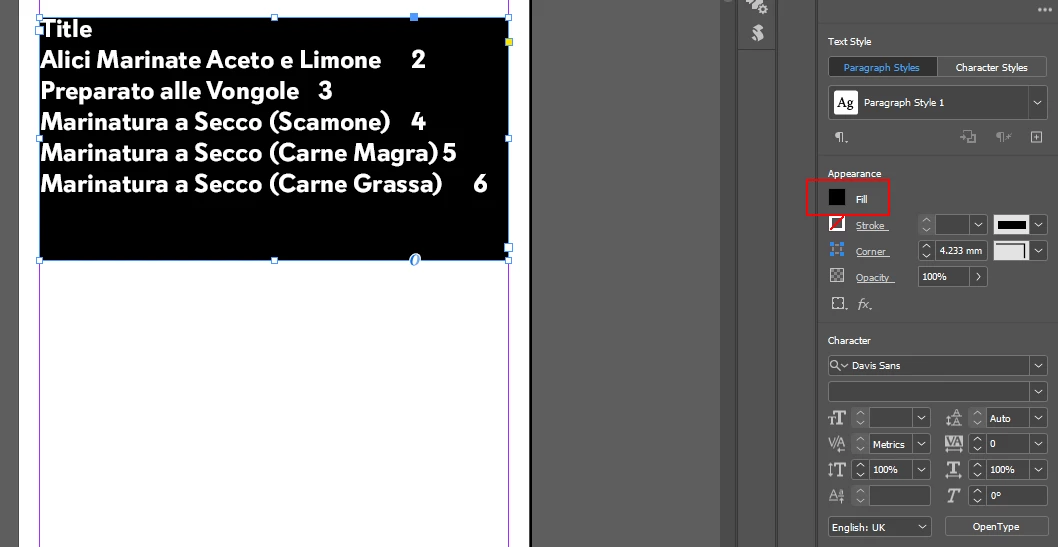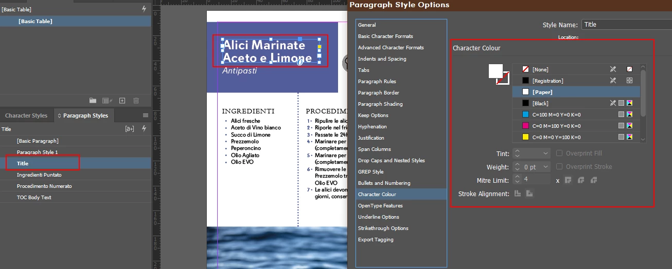 But when I created the Table, the character was formatted in white same as the style "Title" As you can see, I am giving a black background so that you can understand the text is in white. Also, the font and the size are not the ones selected in "Paragraph Style 1" I can quickly fix it by changing the colour and the rest manually, but I would like to understand what I am doing wrong; I have watched quite a few videos on youtube, but it doesn't seem to work, any help?