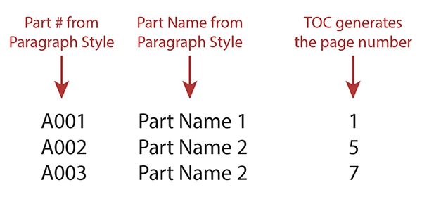 I would like to make a Table of Contents that pulls two pieces of information and puts them in the same line. I have one Paragraph Style for "Part #" and a second Style for "Part Name." Since they are connected information, I'd like to include both, like in the picture: