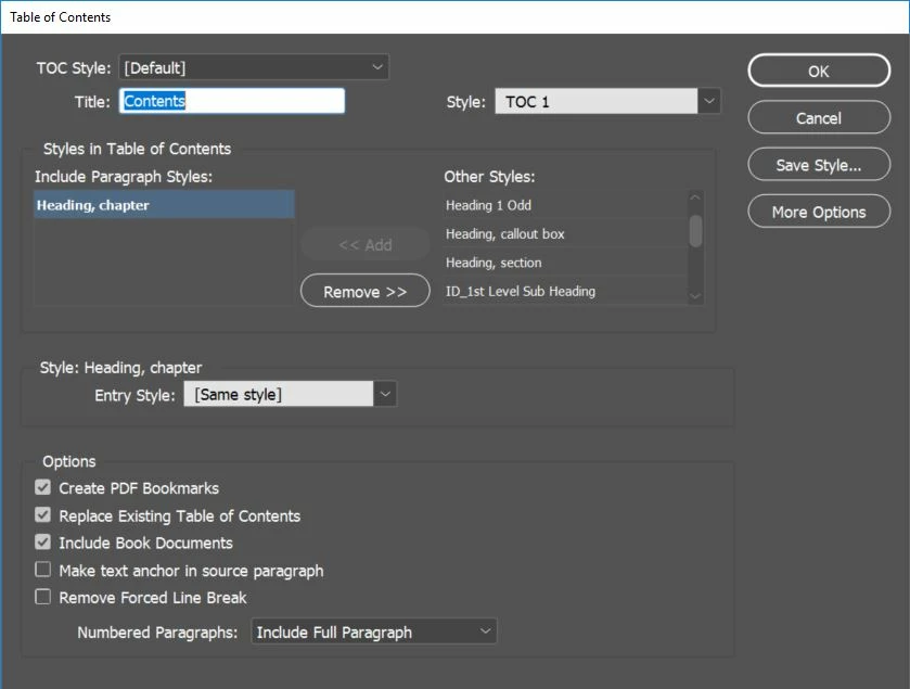I have a book with 10 chapter files, and each one starts with a chapter title "Heading, chapter" style. I want to create a table of contents using these chapter titles, but InDesign isn't wanting to do it.