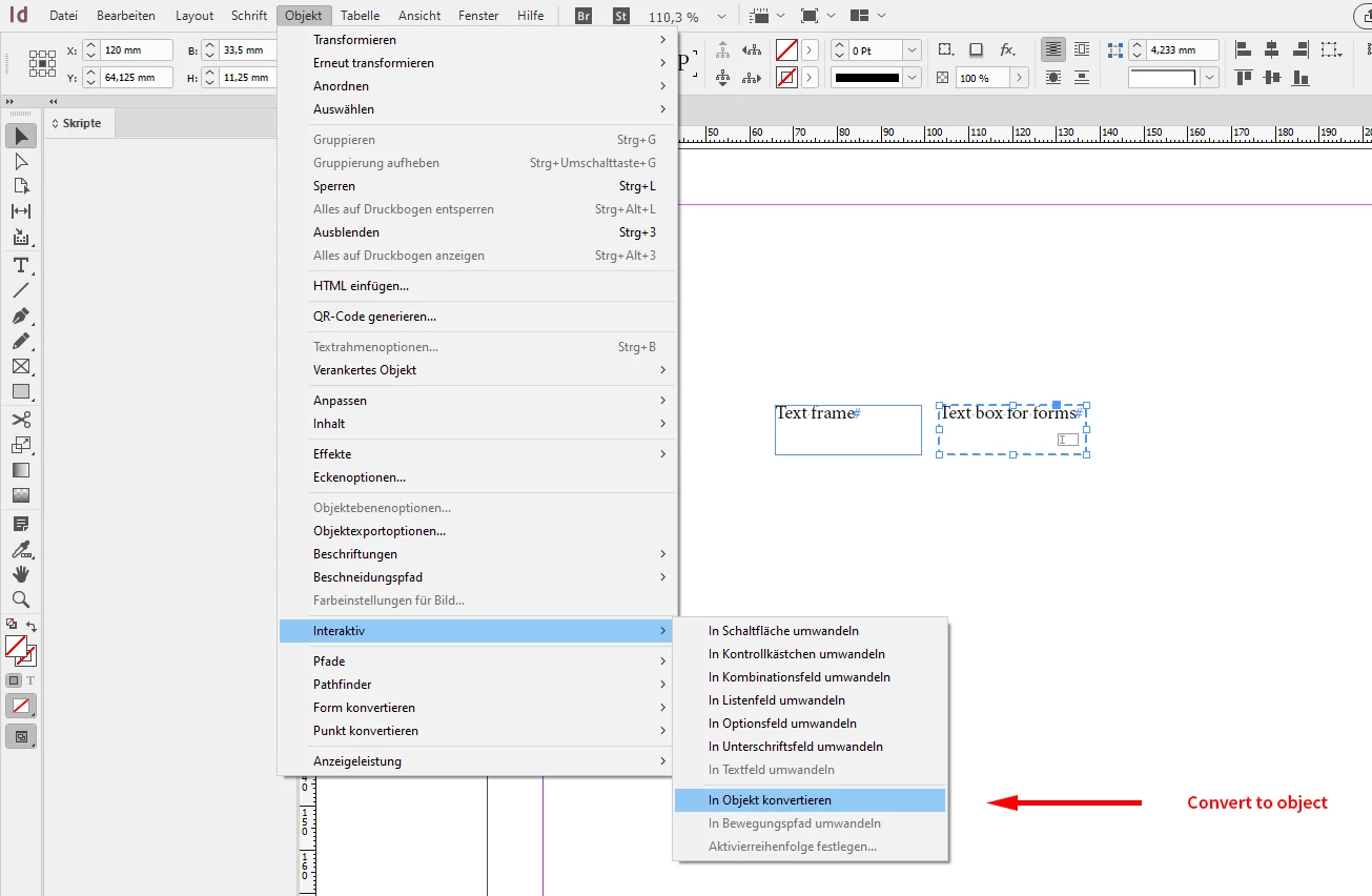 Select the text box, go to Object > Interactive and do Convert To Object.